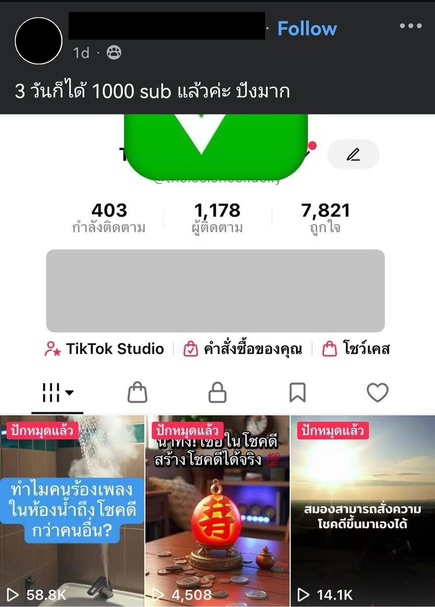 ตอนที่ผมเริ่มปั้นช่องใหม่ๆ ผมลงคลิปทีเดียว 4 platform หลัก (youtube, tiktok, facebook, instagram) ในขณะที่ facebook ไม่มีคนเห็นเลย – ig พอมี follower บ้าง –  youtube เปรี้ยวปร้างประมาณนึง – แต่ tiktok ผมมีคลิปหลักแสนหลักหมื่นหลักแสนวิวภายในไม่กี่วัน